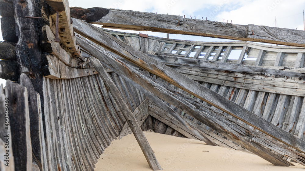 Carcass of boats in a boat cemetery in Brittany in France in February 2022