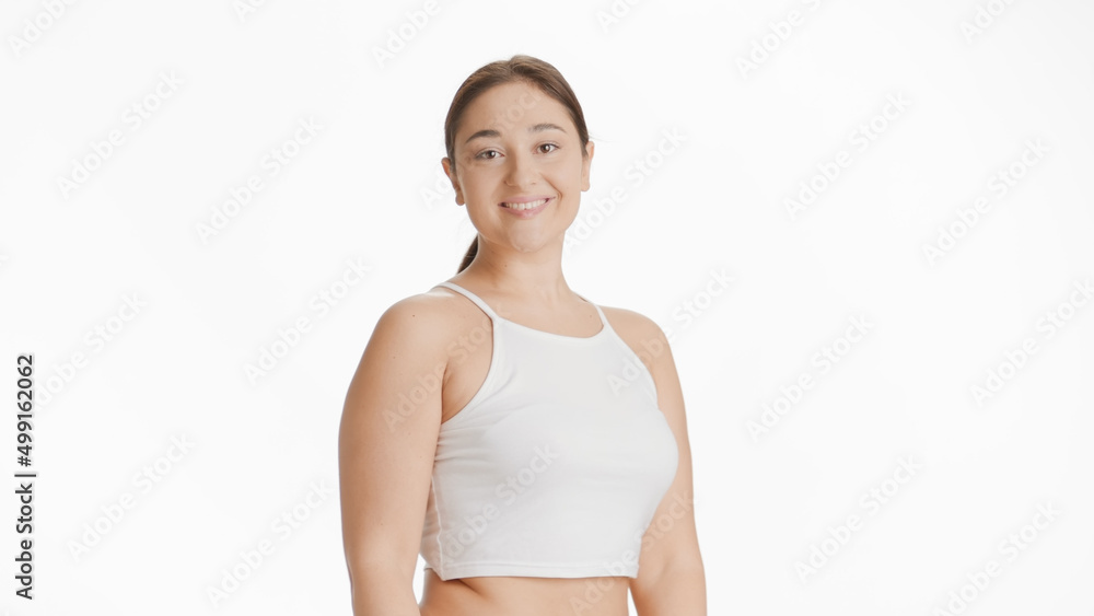 Horizontal medium shot of young dark-haired Caucasian gorgeous plus size woman in white top smiling wide for the camera on white background | Body care concept