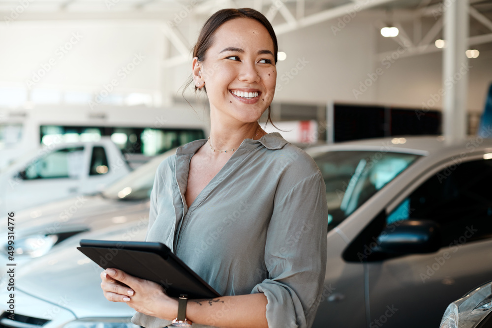 Get ready for the smoothest ride of your life. Shot of a woman using her digital tablet in a car dealership.