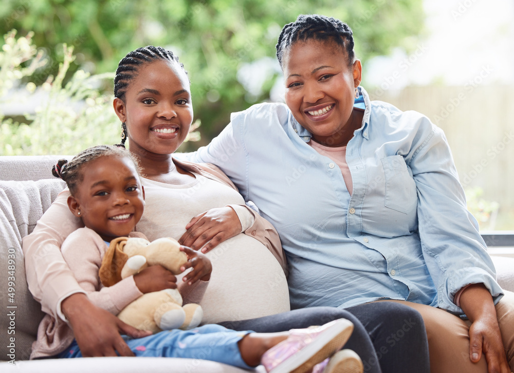 Were hoping its a girl. Cropped portrait of an attractive young pregnant woman sitting on the sofa at home with her mother and daughter.