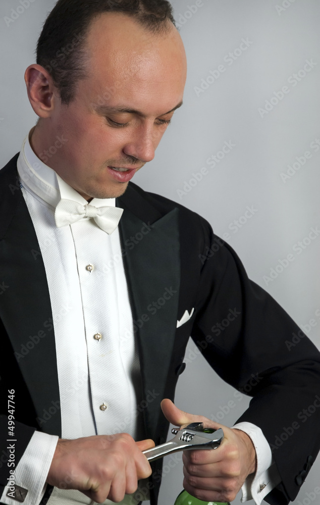 Mann versucht, Flache mit Werkzeug zu öffnen