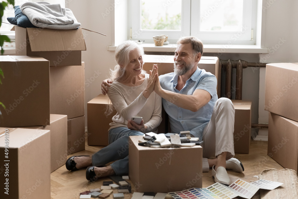 Older spouses sit on floor near heap of tiles samples nearby and cardboard boxes with stuff on move day, giving high five feel happy, made choice of swatches color, prepare house for repairs concept
