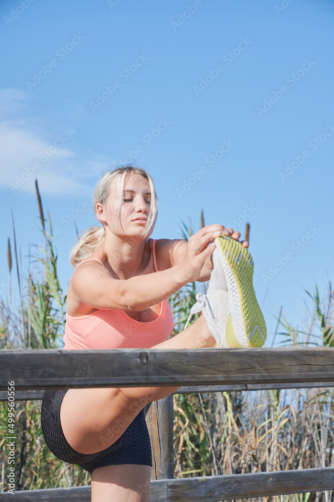 Teenager blonde woman doing stretching exercises during a workout outdoors on a sunny summer day. Teenage healthy habits.