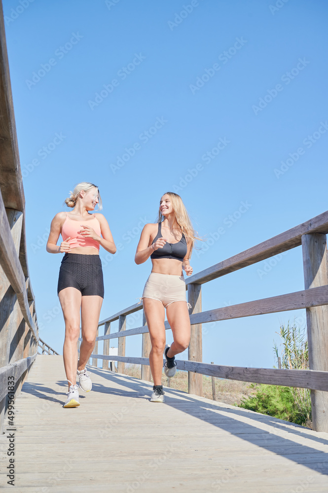A pair of two teenage women do their warm up run exercise during a workout outdoors on a sunny summer day. Teenage healthy habits.