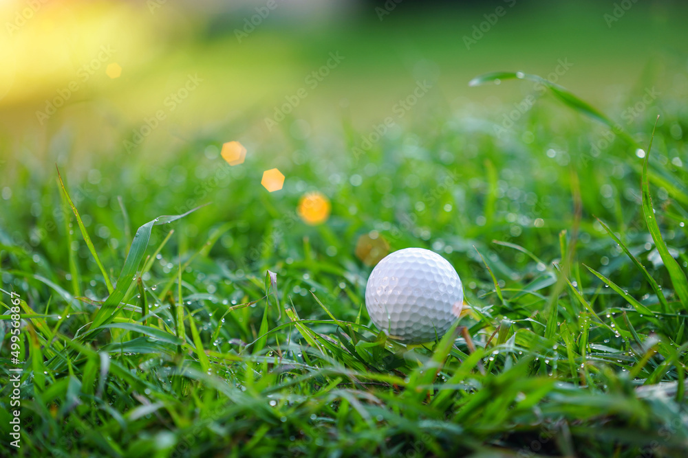 Golf ball is on tee at green lawn in a beautiful golf course with morning sunshine.Ready for golf in the first short.