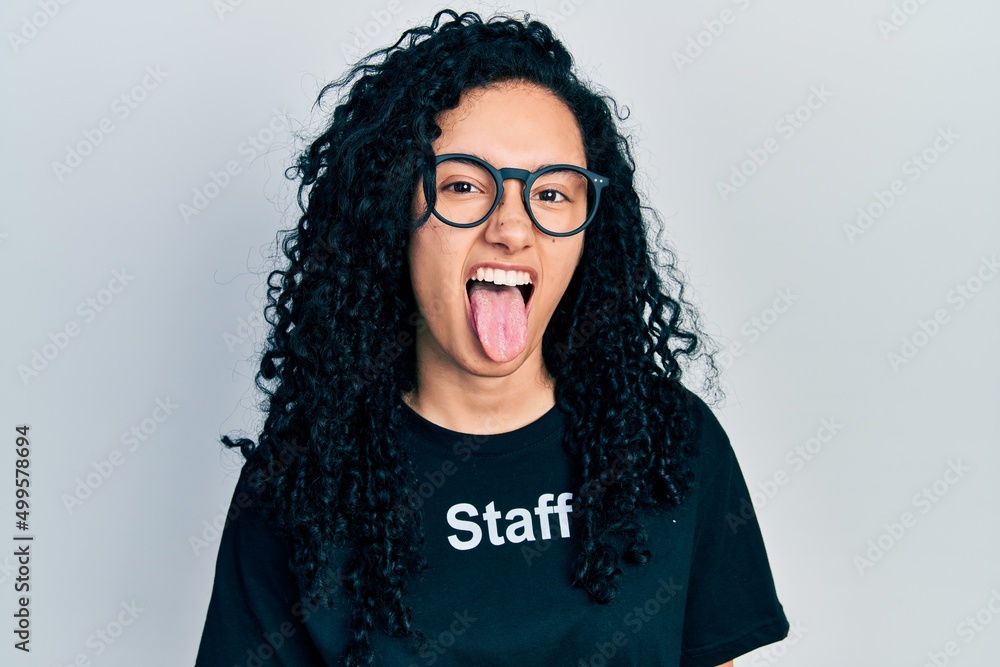 Young hispanic woman with curly hair wearing staff t shirt sticking tongue out happy with funny expression. emotion concept.