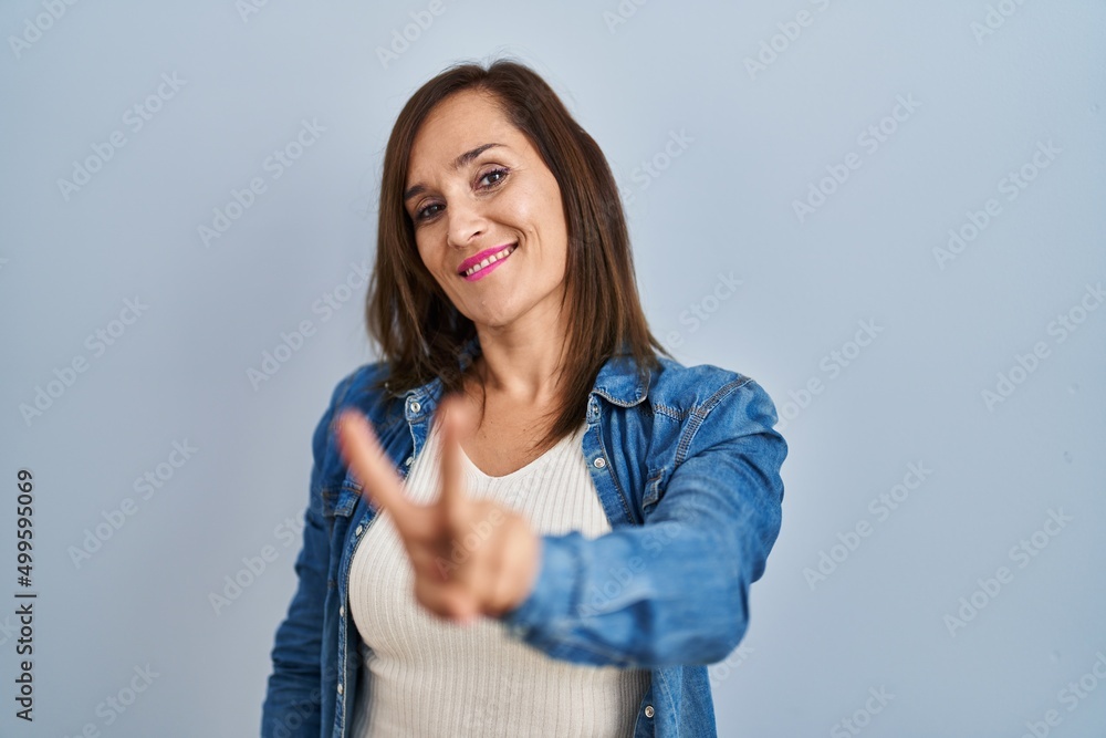 Middle age brunette woman wearing casual denim jacket over isolated background smiling looking to the camera showing fingers doing victory sign. number two.