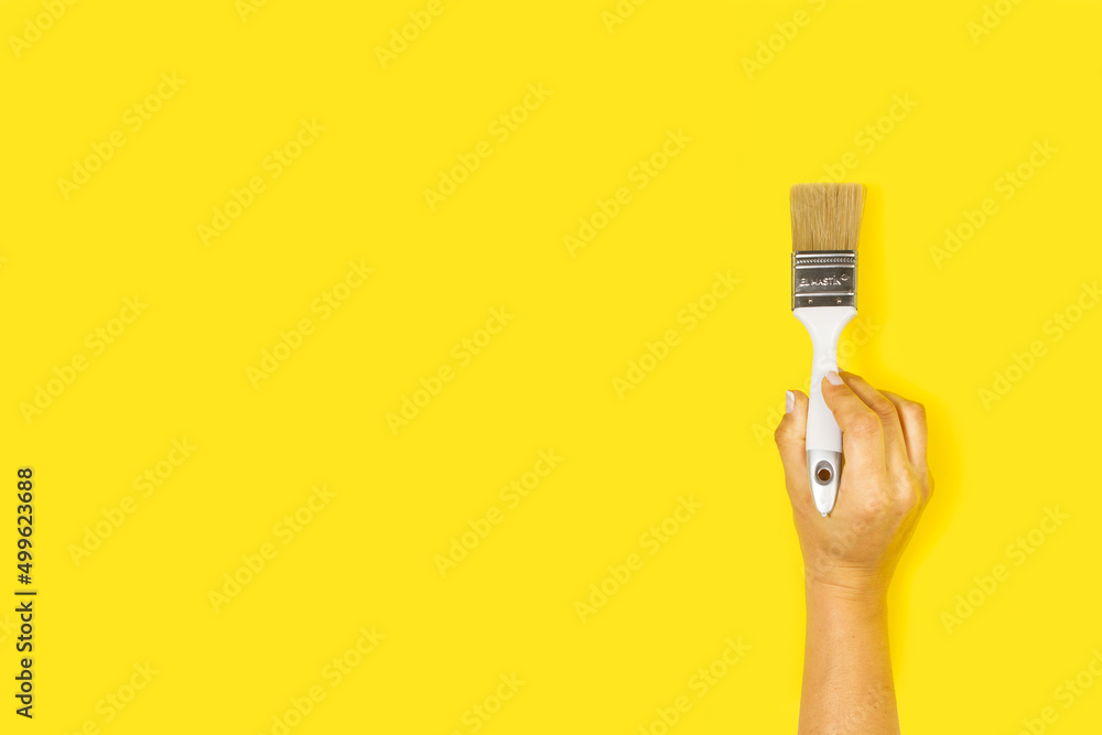 Mano de mujer sosteniendo un pincel brocha sobre un fondo amarillo liso y aislado. Vista de frente y de cerca. Copy space
