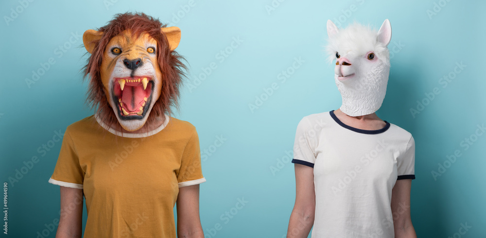 Young woman wearing lion and alpaca mask, standing and looking to the camera, isolated on blue background.