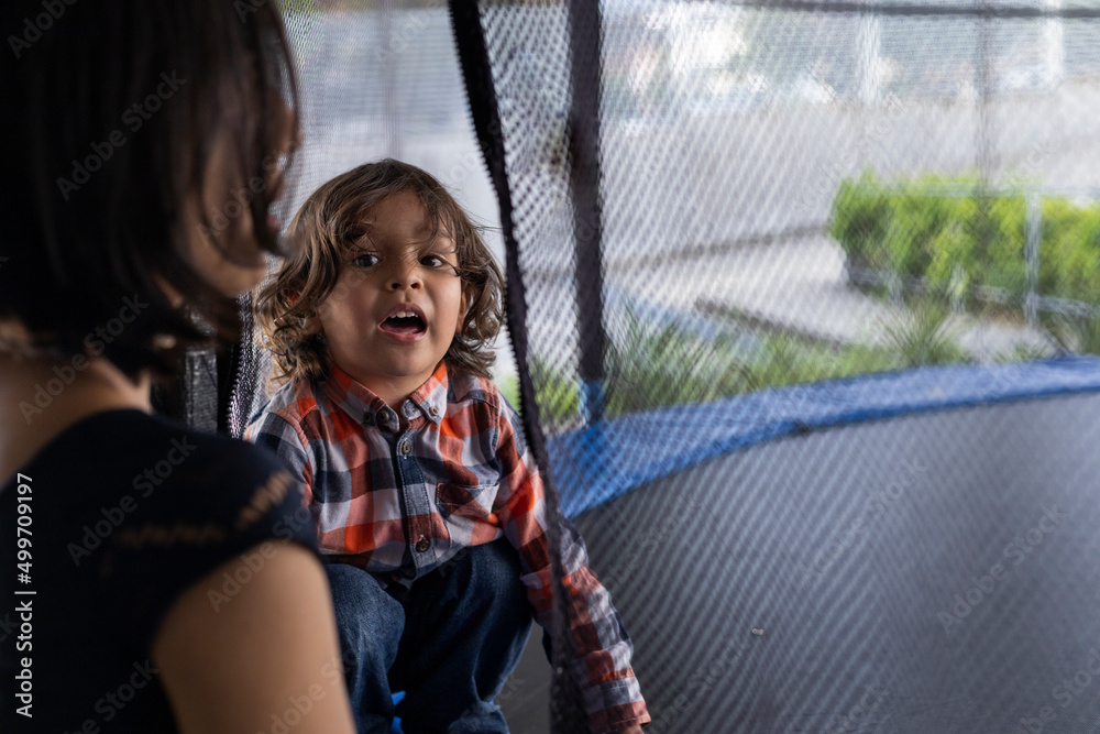 Mom and her Latin American son having fun on a trampoline at a children's playground. Mother's day concept and family