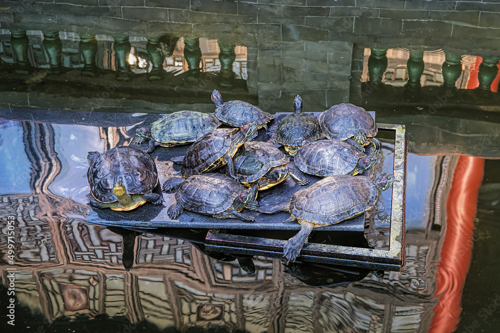 Foshan city, China. Shunde Qinghui Garden is one of the top ten famous gardens in China, Lingnan traditional style feature. Red-eared turtles are living in the pond as a symbol of cosmic order.