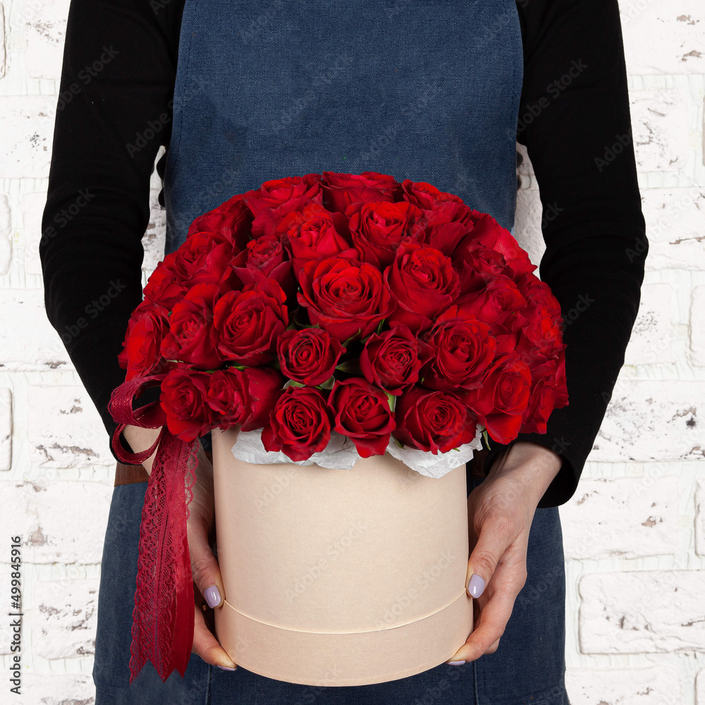 Woman florist holding freshly made blossoming red flower bouquet in box on brick wall background