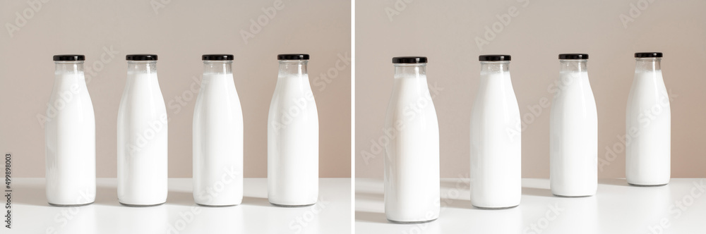 Packaging for dairy products, glass bottles for milk isolated on white background. Unmarked bottles filled with milk.