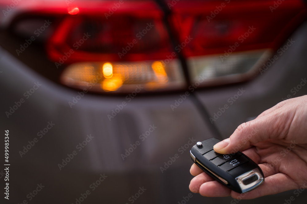 Person closes the car with a remote control key. Alarm system to protect the car. Close-up of the driver's hand