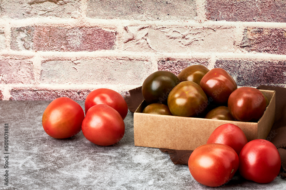Ripe tomatoes of different varieties on a cardboard box on a stone countertop. Healthy food