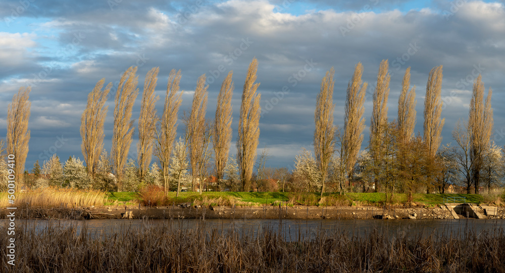 Poplar (Populus) trees growing on the river bank. Cottonwood trees in a row in the spring.