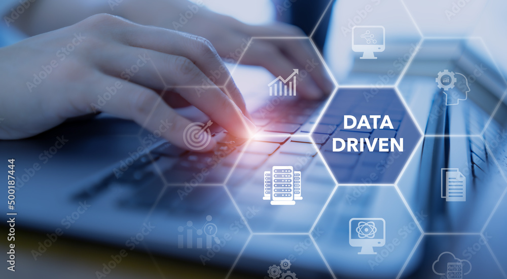 Data driven marketing concept. Big data analytics, personalized and contextual marketing. Marketing technology. Working on computer cubes with data driven surrounded with analytics methodology icons.