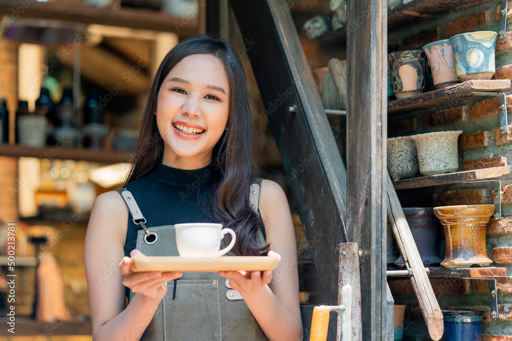 cafe female owner smiling with positive happiness ready to open for customer,asian female woman with apron hand present tray and coffee cup warm welcome condident standing at entrance of coffeeshop