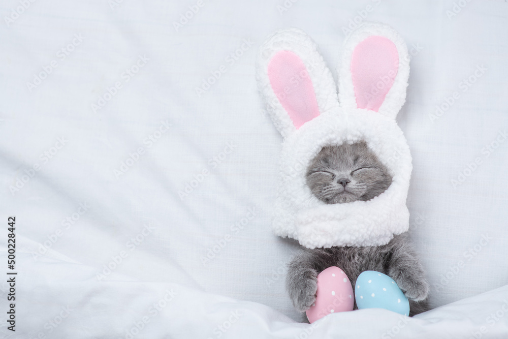 Funny kitten wearing easter rabbits ears sleeps with painted eggs on a bed under warm white blanket at home. Top down view. Empty space for text