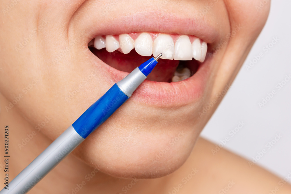 Cropped shot of a young woman pointing to white spots on the tooth enamel with a pen. Oral hygiene, dental health care. Dentistry, demineralization of teeth, enamel hypoplasia, fluorosis