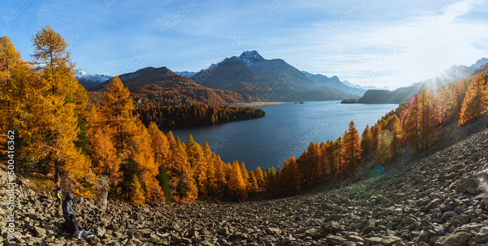 Lake sils in autumn colors: one of the most beautiful alpine lakes in switzerland, near the village of Sils Maria, Engadine, Switzerland - October 2021.