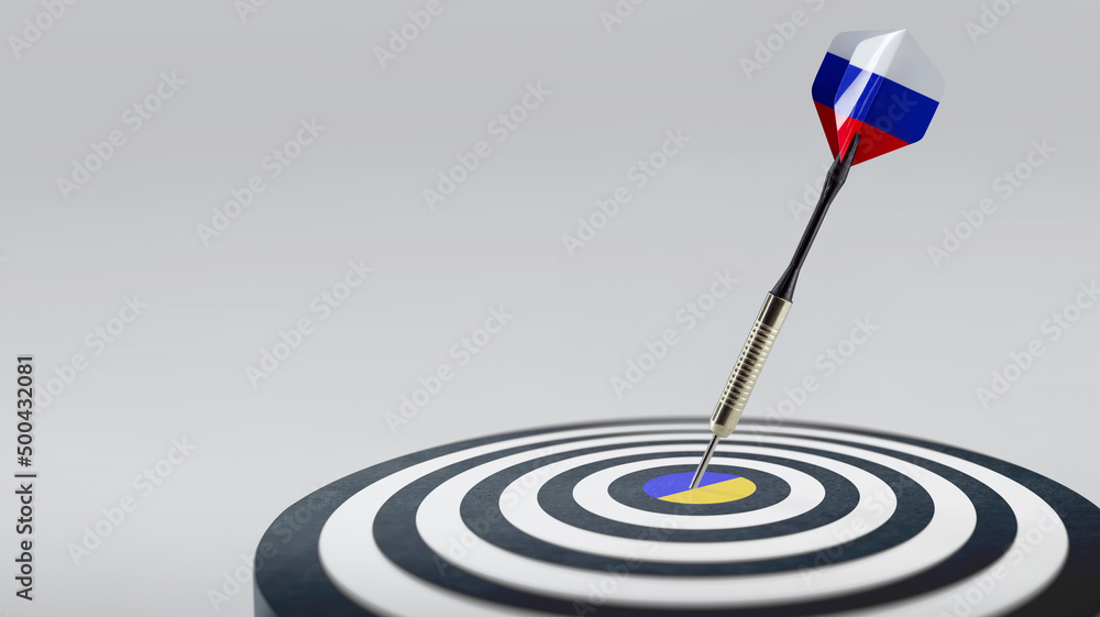 Dart with Russian flag symbolizing the conflict and control of Ukraine. Target with Ukrainian flag in the centre close up.