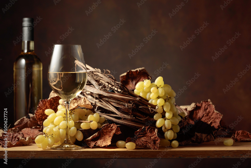 White wine and bunch of grapes.