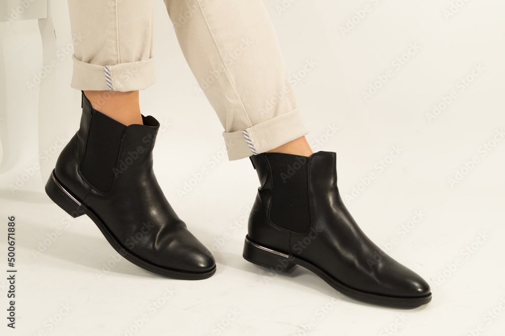 Close up view of a women's black leather chelsea boots. With white background. Footwear fashion concept.