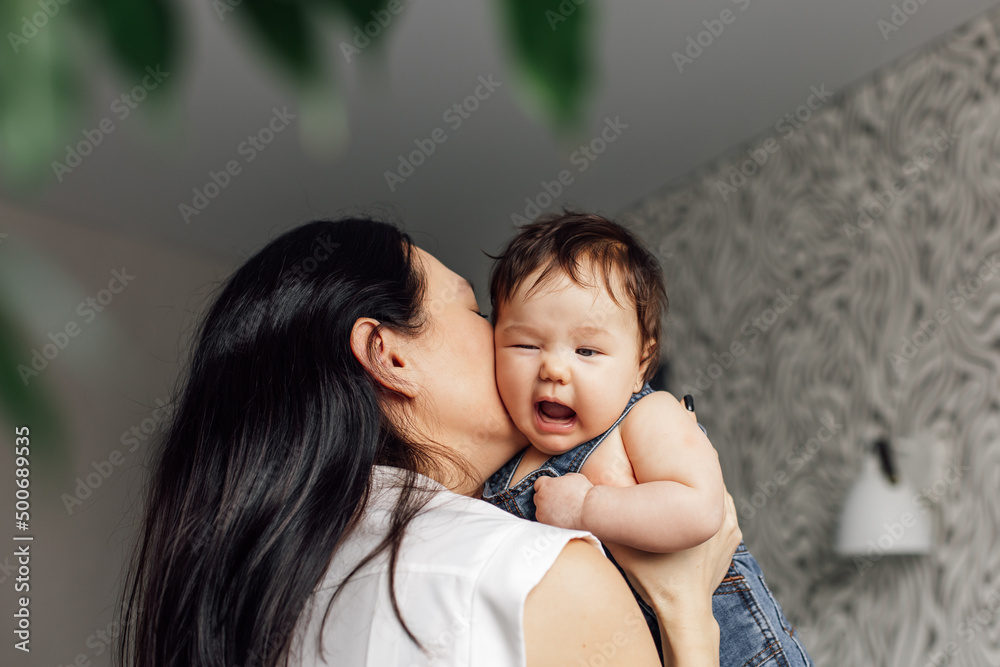Portrait of loving mother with little daughter in bedroom closeup, blurred background, soft focus. Embrace and kiss discontent baby, capture happy emotion. Concept of maternal affection and childcare.