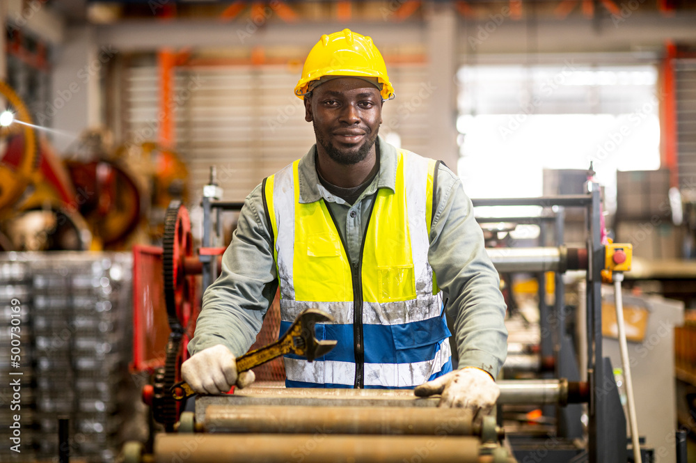 Portrait of happy maintenance worker with confident service at factory warehouse.