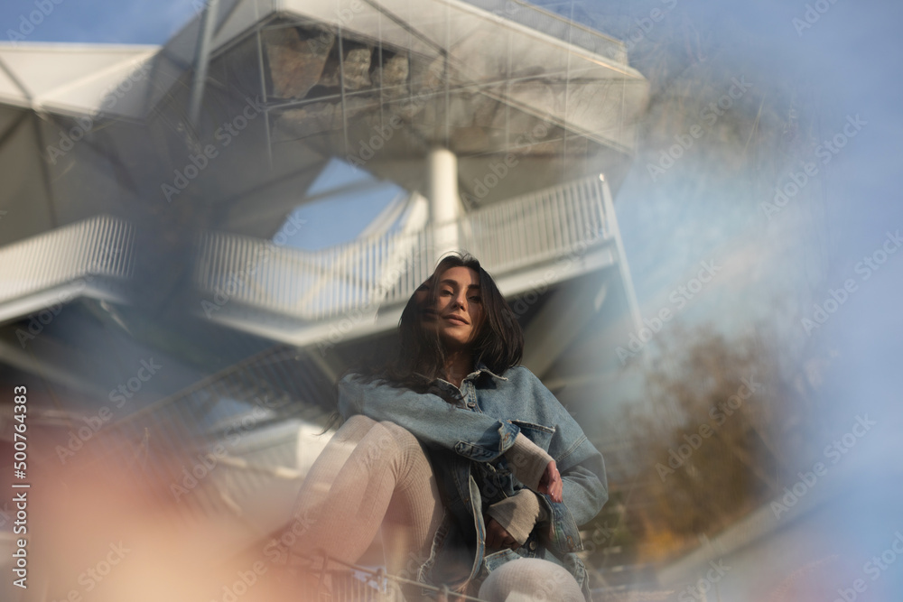 Wunderschöne Frau in Anzug und Jeans an Terrassen Aussichts Plattform im Sonnen Untergang Luxus