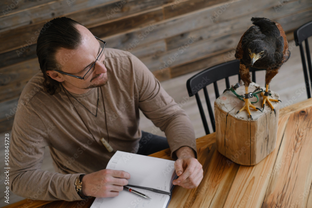 Man is working, writing with wild bird at home by the table. Making noted, memories, diary with eagle as pet. Unusual animals at home. Human friendship. Taking care of buzzard Top iew