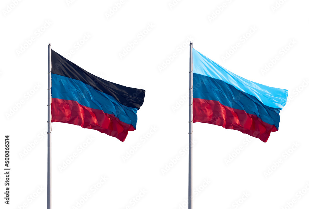 Waving flags of Donetsk People's Republic and Lugansk People's Republic isolated on a white background