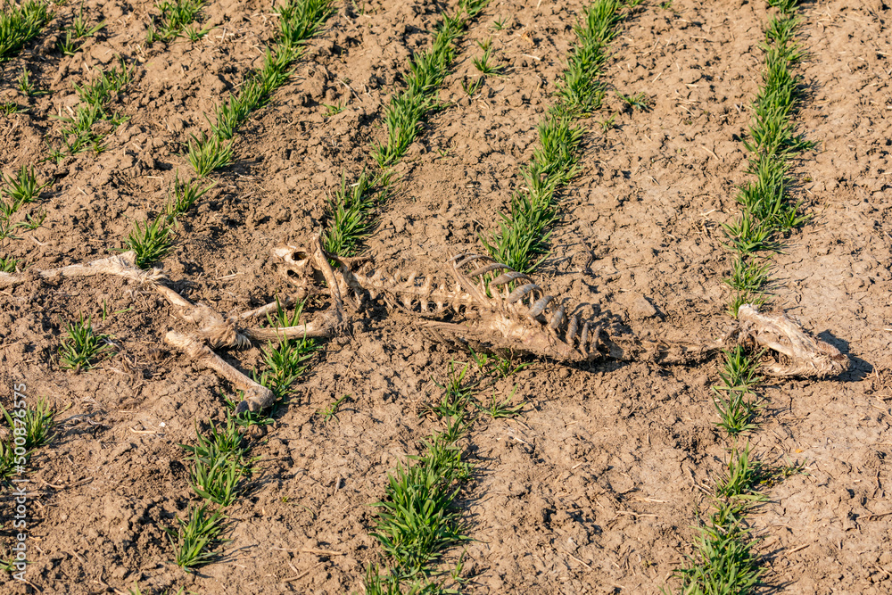 A skeleton of a dead deer or other animal lies on an agricultural field