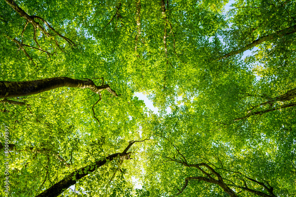 空気のキレイな田舎のブナ林で空を見上げて深呼吸したくなるような新緑の葉が伸びる空