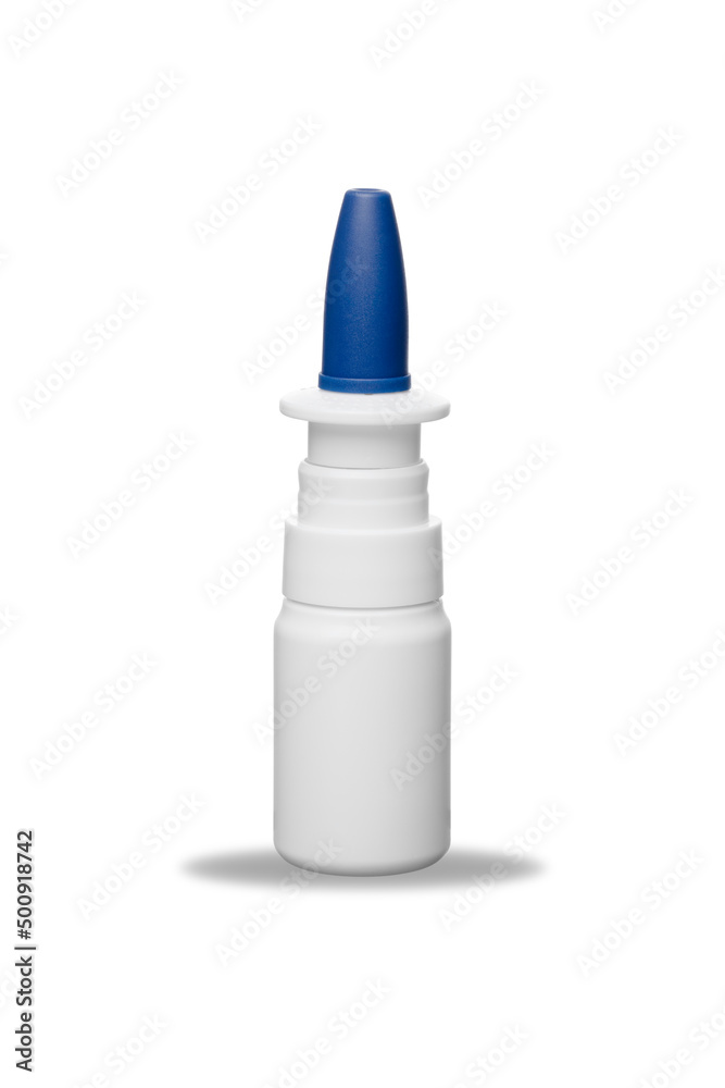 Nasal spray plastic bottle with blue cap and soft shadow isolated on white background. Pharmaceutical packaging mockup.