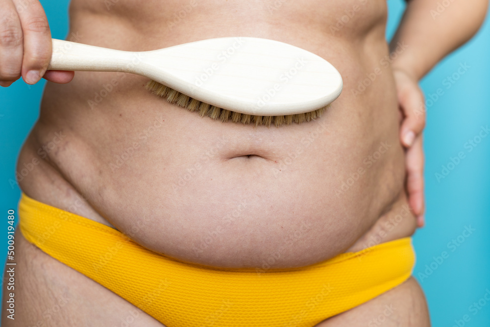 Closeup of unrecognizable fat plump plus-size woman standing in yellow underpants swimsuit, brushing lymphatic drainage massage of stomach by wooden brush. Anticellulite treatment, homemade body care.