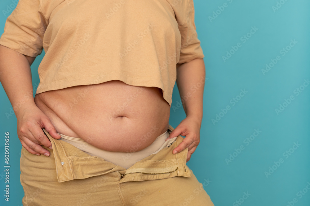 Cropped photo of fat plus-size overweight woman in beige T-shirt holding unzipped jeans, showing excess naked abdomen on blue background. Unhealthy diet, cellulite, obesity, weight loss, liposuction.