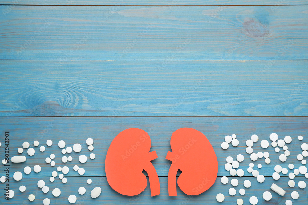 Paper cutout of kidneys and pills on blue wooden table, flat lay. Space for text