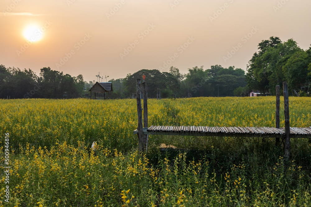 A panoramic view of the beautiful blooming yellow Crotalaria juncea garden.