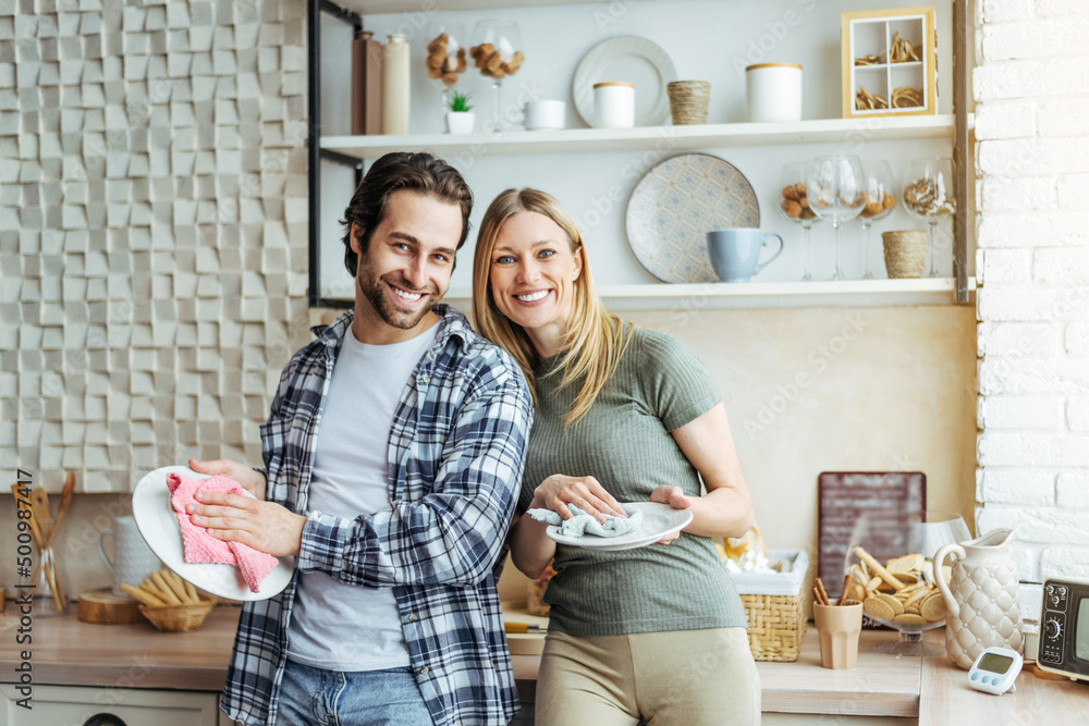 Cheerful young european lady and male washing dishes in modern kitchen interior. Hygiene, household chores in spare time
