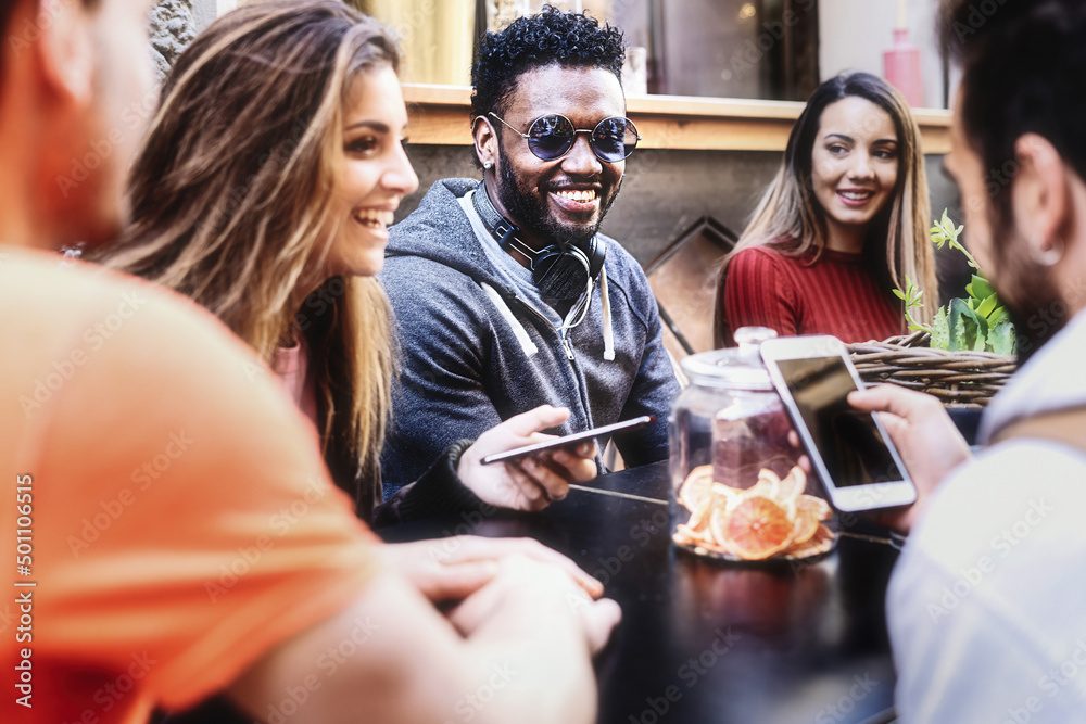 A group of young people get together for breakfast having fun using smartphones and social networks - lifestyle concept of friends meeting and using internet and new technologies