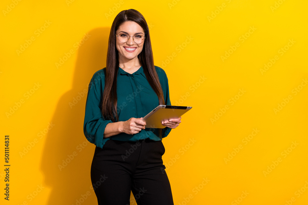 Photo of young pretty woman use tablet ceo boss expert economist isolated over yellow color background