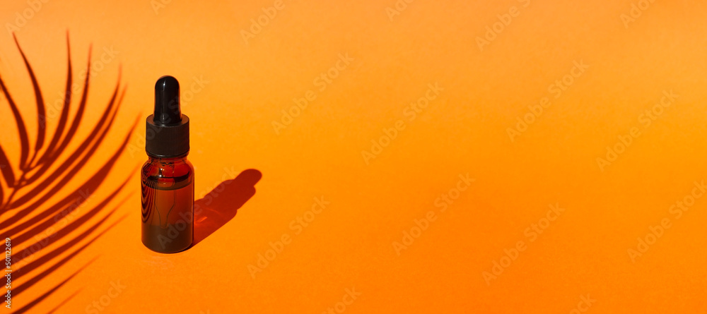Bottle with dropper pipette with serum or essential oil. Orange background with daylight and beautiful palm shadows.
