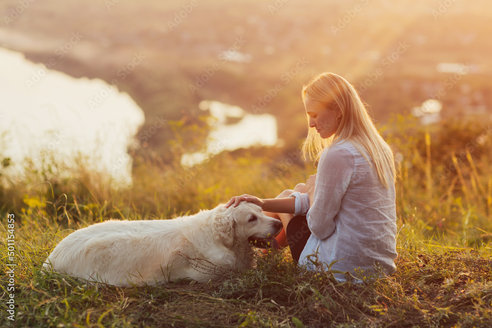 Young woman and golden retriever dog on the hill on green grass. Pets friendly travel concept, solar bright effect.