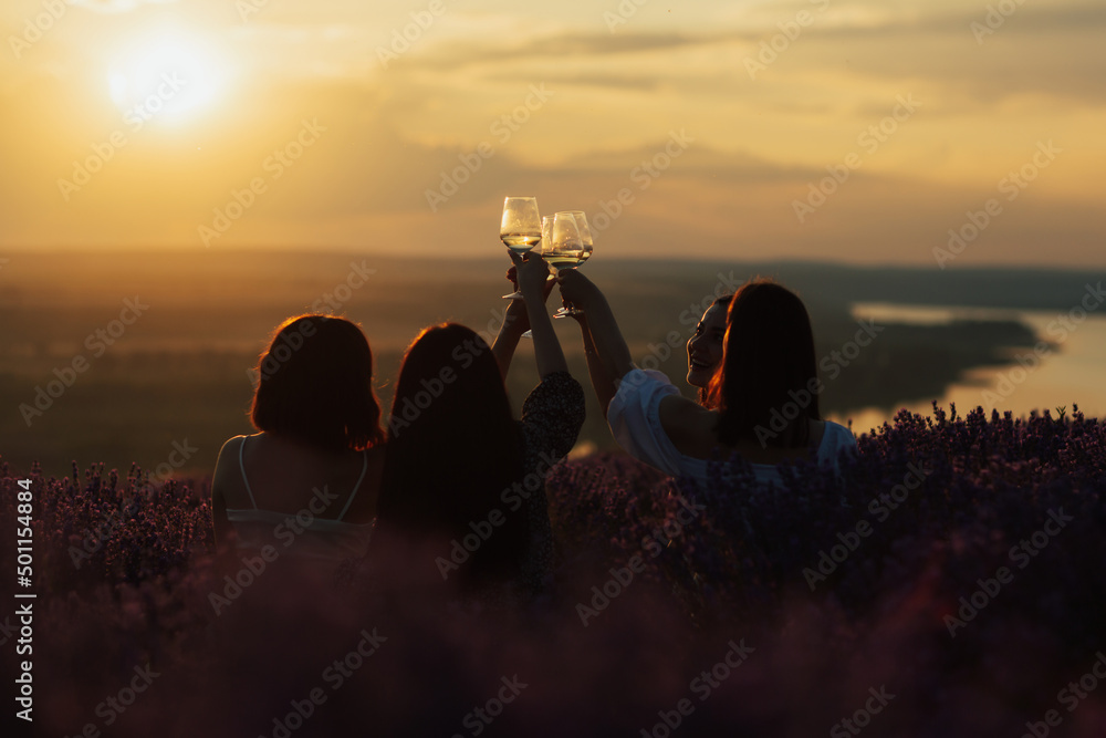 Silhouette of girlfriends enjoying their time together on a picnic in the lavender field at amazing sunset. Friends sitting on a picnic blanket and clinking glasses. Leisure and free time. Copy space