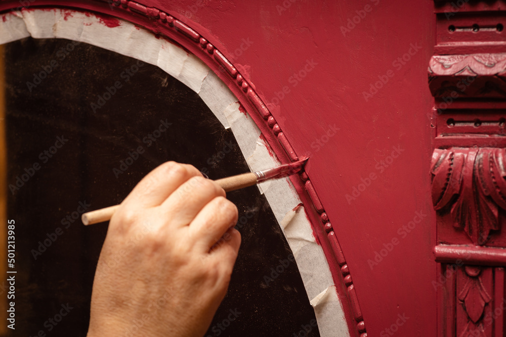 Hand with brush aging wooden cupboard door with glass with carved ornaments. Process of furniture patination. Eco-friendly re-usage. Old things getting new life.