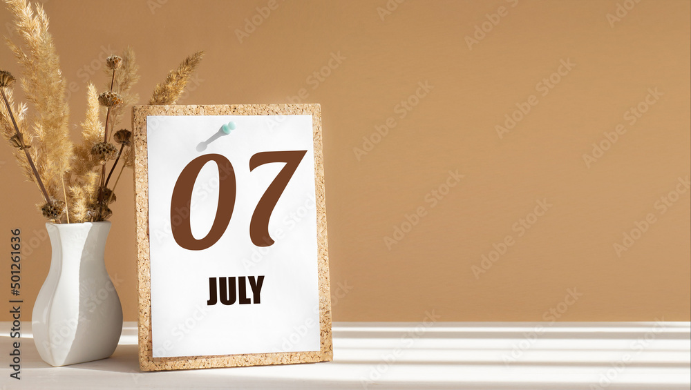 july 7. 7th day of month, calendar date.White vase with dead wood next to cork board with numbers. White-beige background with striped shadow. Concept of day of year, time planner, summer month