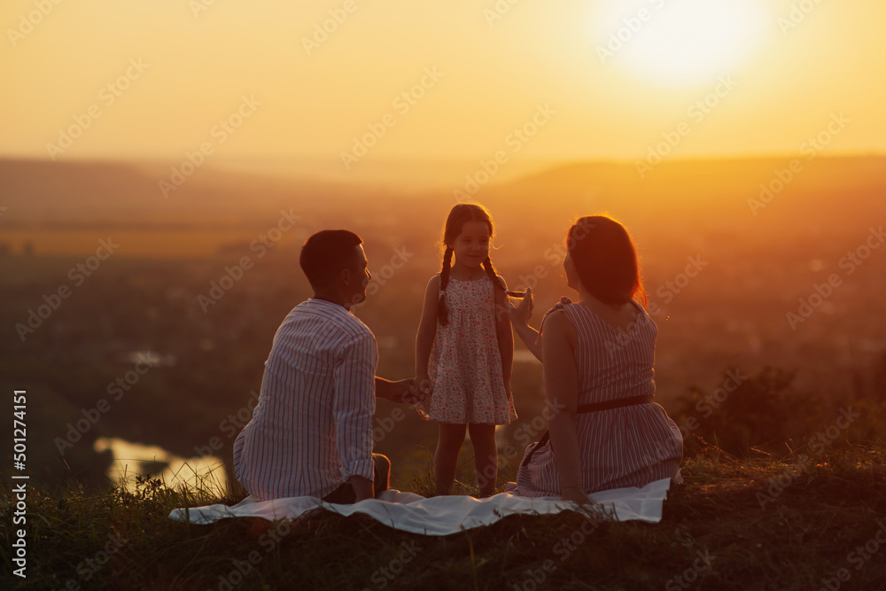 Blonde girl and big dog sitting on the mountain at sunset on countryside background.