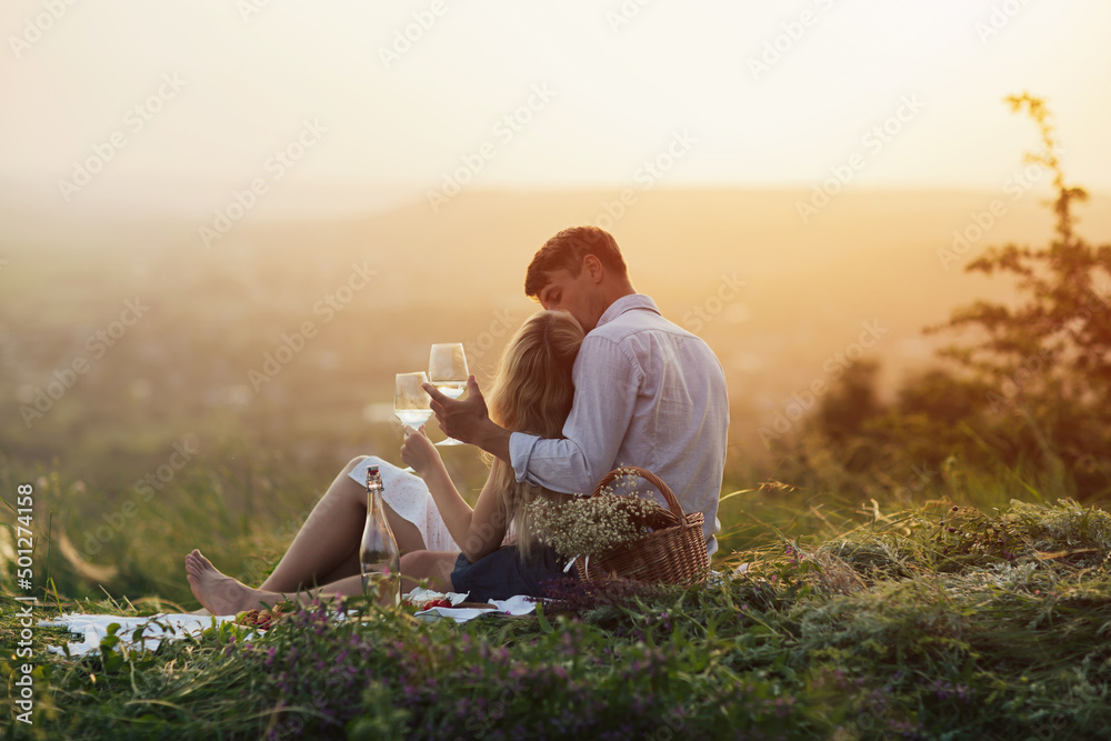 Beautiful young happy couple relaxing together on mountain at sunset with beautiful landscape on background.